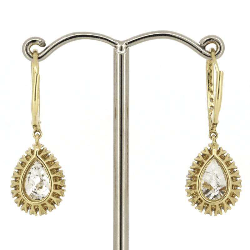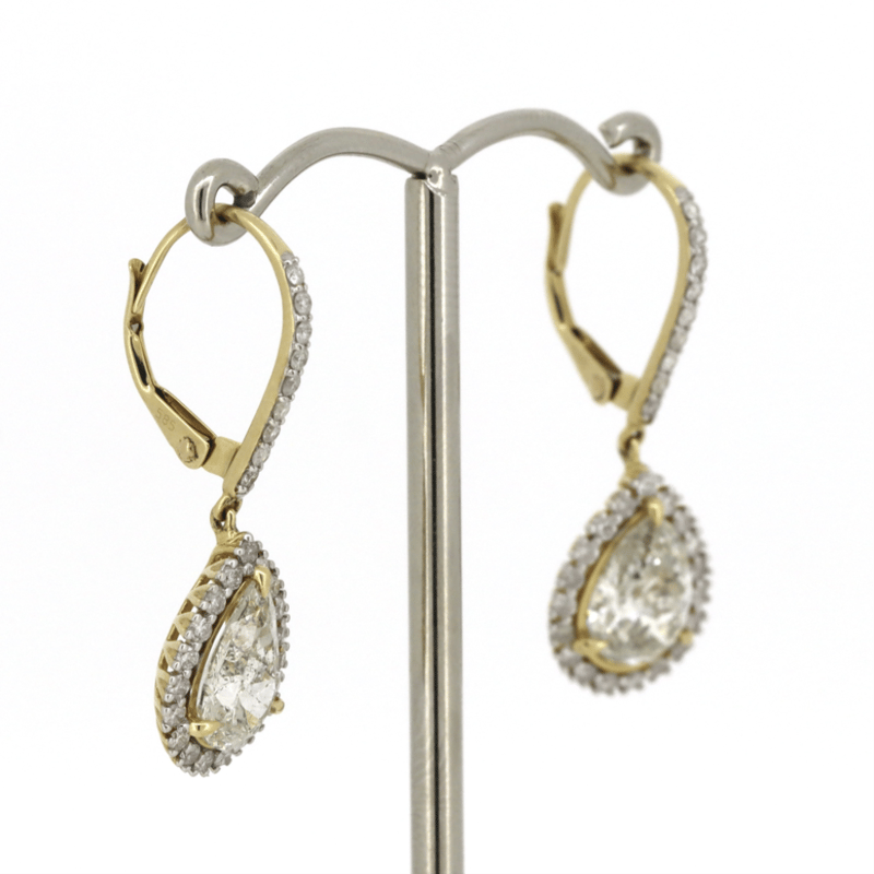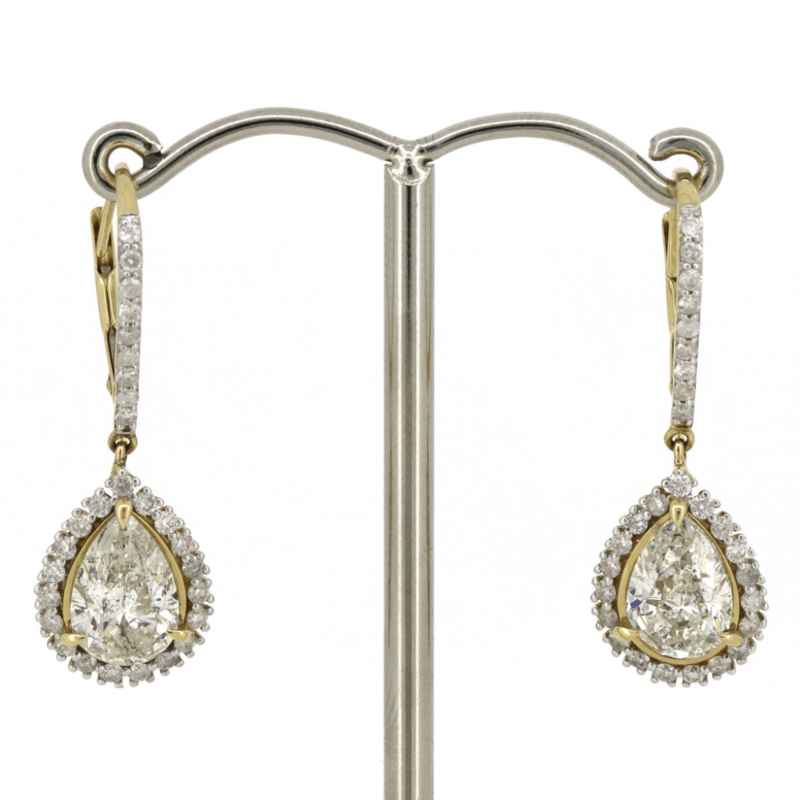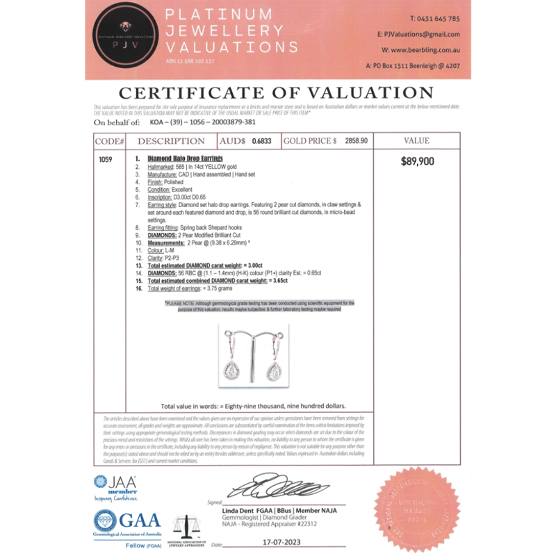 14K YELLOW GOLD DIAMOND HALO DROP EARRINGS. THE DESIGN FEATURES, 2 PEAR CUT, DIAMONDS (3.00CT TDW, L-M COLOUR, P2-P3 CLARITY), CLAW SET. ENCOMPASSING THE DESIGN ARE, 56 ROUND BRILLIANT CUT, DIAMONDS (0.65CT TDW, H-K COLOUR, P1+ CLARITY) MICRO-BEAD SETTINGS. THE EARRINGS HAVE SPRING BACK SHEPARD HOOKS. Valuations Provided by an Independent Third-Party Professional Not Directly Associated With Lloyds Auctions at AUD $89900This valuation has been conducted by an independent third-party professional. The valuation amount is an assessment by the issuing valuer and does not reflect the auction value of the item. Any inquiries regarding the valuation should be directed to the issuing valuer (refer to contact details on the certificate), as Lloyds Auctions has no affiliation or influence over the valuation, the valuer, or the stated amount. Condition: Good - Refer Images 0645863+5072