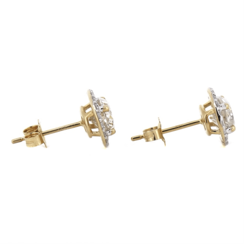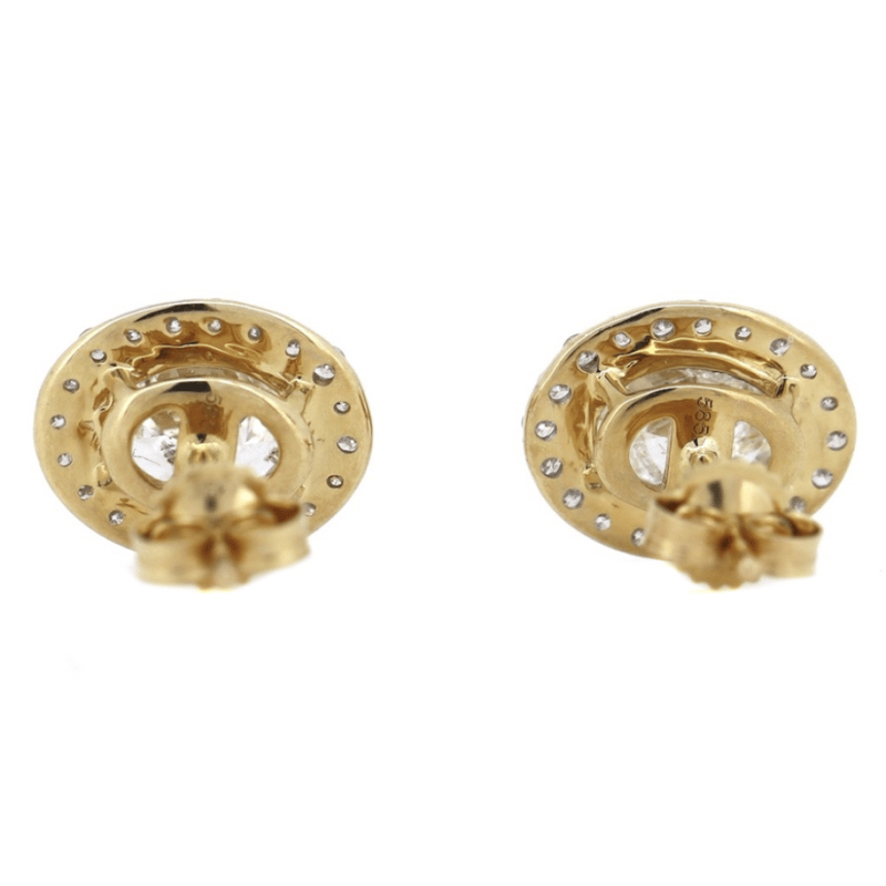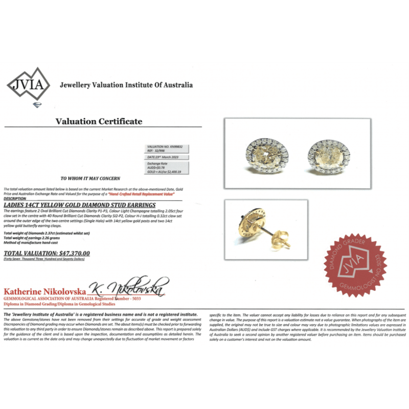 14K YELLOW GOLD, CHAMPAGNE DIAMOND AND DIAMOND, HALO STUD EARRINGS. THE CENTRES FEATURE, 2 OVAL BRILLIANT CUT, LIGHT CHAMPAGNE, DIAMONDS (2.05CT TDW, P1-P3 CLARITY), 4 CLAW SET. SURROUNDING THE CENTRES IN HALOS ARE, 40 ROUND BRILLIANT CUT, DIAMONDS (0.32CT TDW, H-J COLOUR, SI2-P2 CLARITY), CLAW SET. THE EARRINGS HAVE POST BACKS WITH 14K YELLOW GOLD BUTTERFLY CLASPS. Valuations Provided by an Independent Third-Party Professional Not Directly Associated With Lloyds Auctions at AUD $47370This valuation has been conducted by an independent third-party professional. The valuation amount is an assessment by the issuing valuer and does not reflect the auction value of the item. Any inquiries regarding the valuation should be directed to the issuing valuer (refer to contact details on the certificate), as Lloyds Auctions has no affiliation or influence over the valuation, the valuer, or the stated amount. Condition: Good - Refer Images 0645863+5053