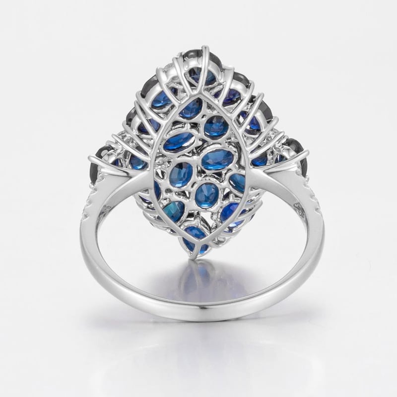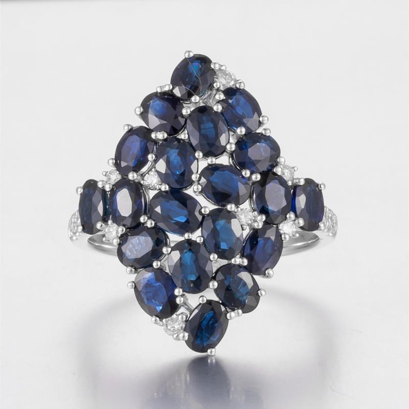 14CT WHITE GOLD AUSTRALIAN SAPPHIRE AND DIAMOND COCKTAIL RING FEATURING CENTRE, 20 OVAL CUT, DARK BLUE-BLACK AUSTRALIAN SAPPHIRES (5.18CT TSW, MODERATELY INCLUDED), CLAW SET, WITH 16 ROUND BRILLIANT CUT DIAMONDS (0.23CT TDW, F-G COLOUR, VS2 CLARITY), BEAD SET. RING SIZE O. Valuations Provided by an Independent Third-Party Professional Not Directly Associated With Lloyds Auctions at AUD $23000This valuation has been conducted by an independent third-party professional. The valuation amount is an assessment by the issuing valuer and does not reflect the auction value of the item. Any inquiries regarding the valuation should be directed to the issuing valuer (refer to contact details on the certificate), as Lloyds Auctions has no affiliation or influence over the valuation, the valuer, or the stated amount. Condition: Good - Refer Images 0586216+520