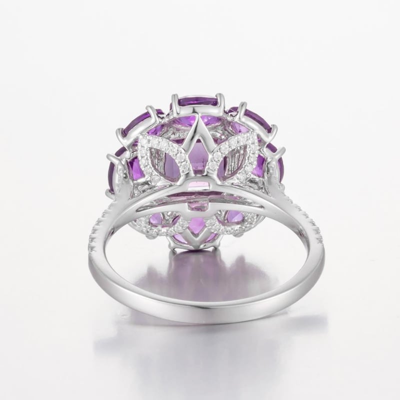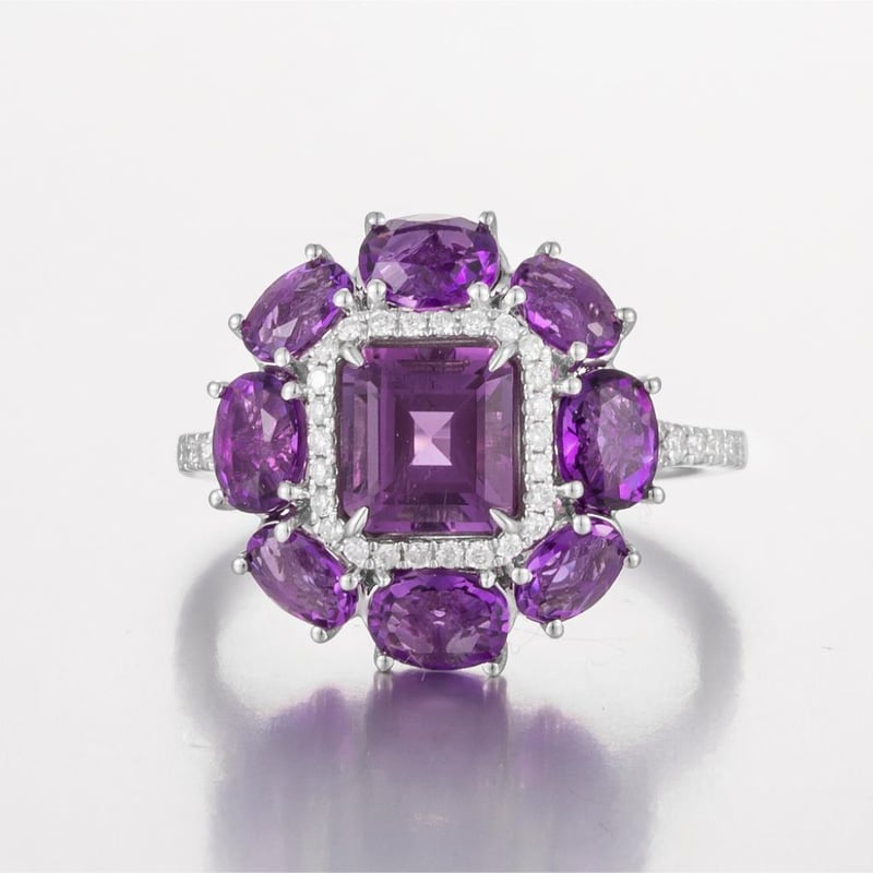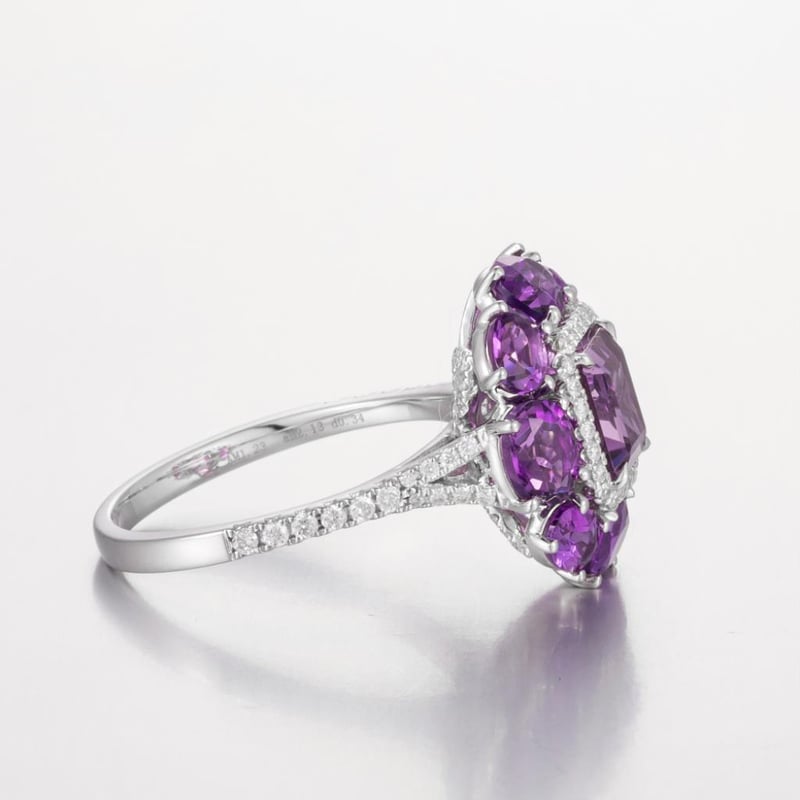 14CT WHITE GOLD AMETHYST AND DIAMOND STATEMENT RING FEATURING CENTRE, ONE STEP AND 8 OVAL CUT, DEEP ROYAL PURPLE AMETHYSTS (3.36CT TSW, MODERATELY INCLUDED), CLAW SET, WITH 94 ROUND BRILLIANT CUT DIAMONDS (0.34CT TDW, G-H COLOUR, VS1-VS2 CLARITY), PIP CLAW SET. RING SIZE O. Valuations Provided by an Independent Third-Party Professional Not Directly Associated With Lloyds Auctions at AUD $22400This valuation has been conducted by an independent third-party professional. The valuation amount is an assessment by the issuing valuer and does not reflect the auction value of the item. Any inquiries regarding the valuation should be directed to the issuing valuer (refer to contact details on the certificate), as Lloyds Auctions has no affiliation or influence over the valuation, the valuer, or the stated amount. Condition: Good - Refer Images 0586216+539