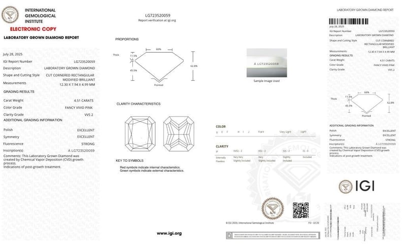 Igi Certificate # Lg 723520059 Laser Inscribed : Labgrown Igi Lg 723520059 Polish : Excellent Symmetry : Excellent Flourescence : Strong Type : Cvd