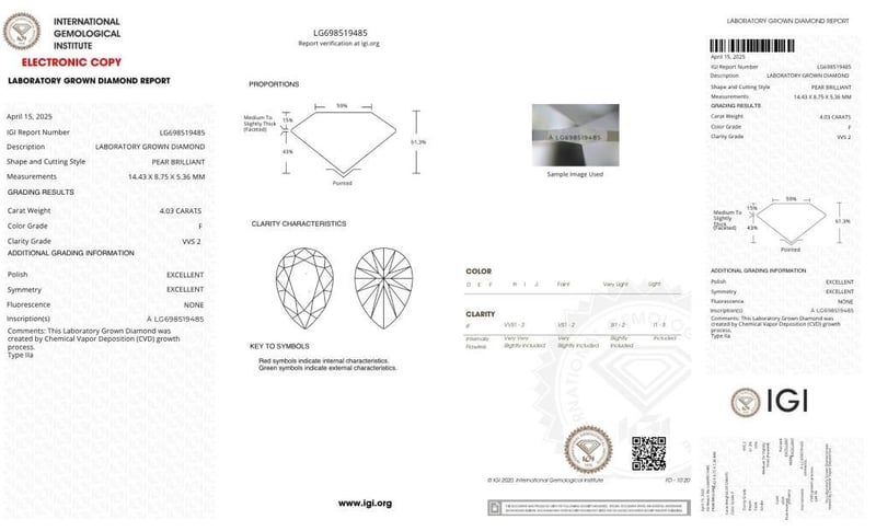 4.03 CARAT PEAR SHAPE DIAMOND F/VVS2 Igi Certificate # Lg 698519485 Laser Inscribed : Labgrown Lg 698519485 Polish : Excellent Symmetry : Excellent Flourescence : None Type : Cvd Condition: Good - Refer Images 0488969+12
