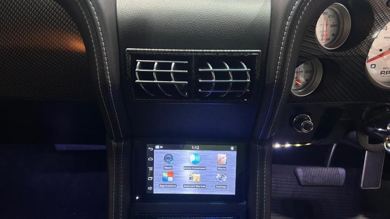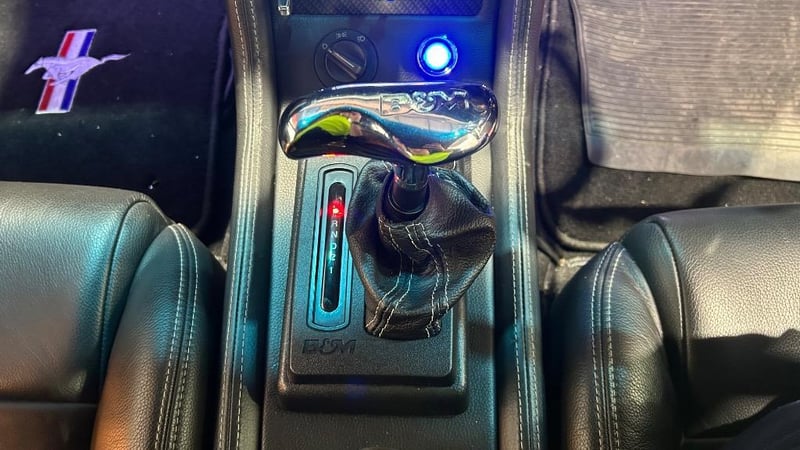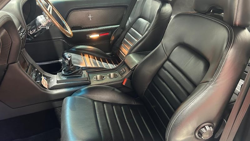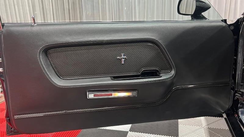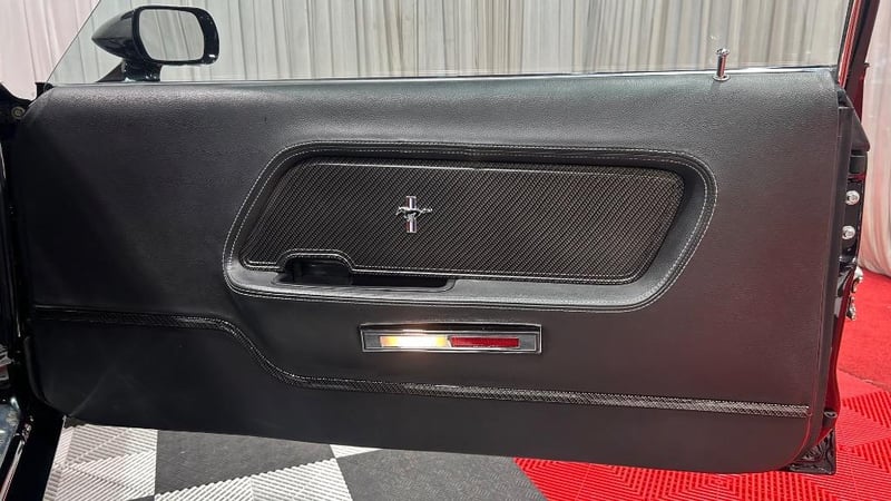 The interior has been restored to Mach 1 deluxe specifications with custom upgrades including B&M shifter, carbon fibre console inserts, leather trim, cobra wood steering wheel, autometer instrument cluster, and integrated roll bar. Modern comforts include Dynamat insulation, RAB air conditioning, electric windows, Bluetooth, GPS, reversing camera and ICE push-to-start ignition.