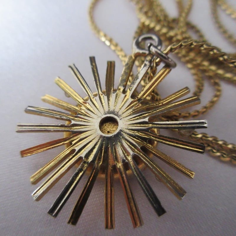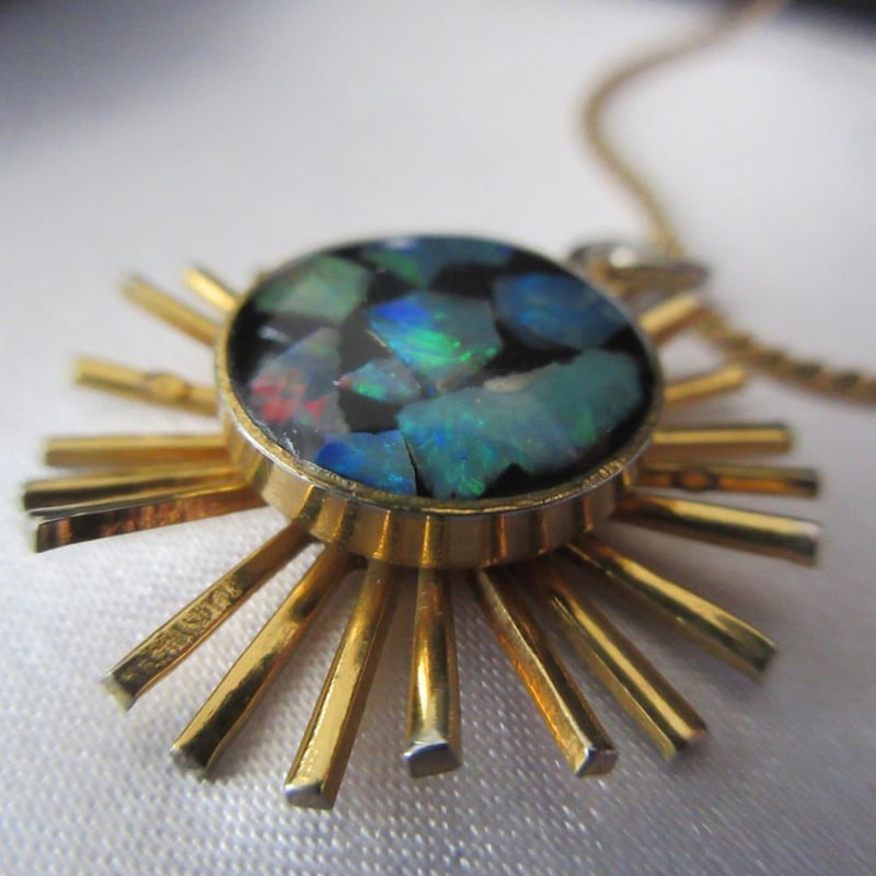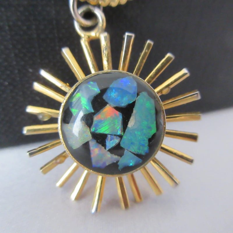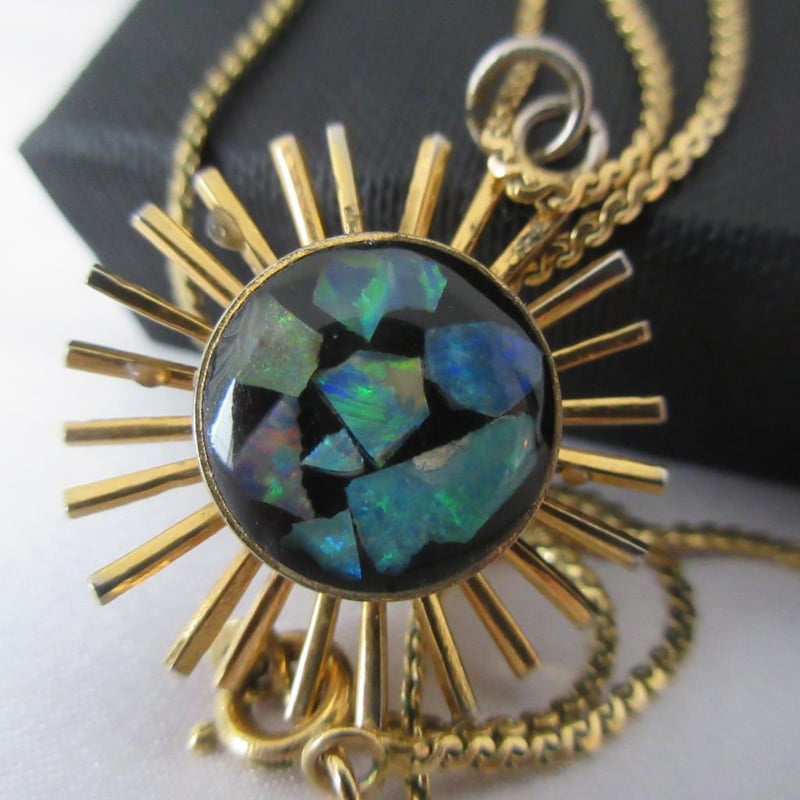 Estate Vintage Opal Sunburst Pendant (approx 30mm diameter) & Chain (Boxed)