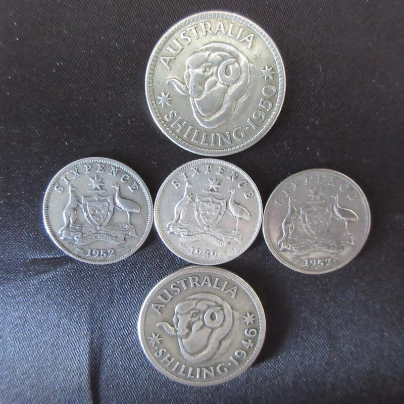 Estate (5) x Australian Silver Coins - Several Rare - C1939 Sixpence (1.6M Minted - Sterling Silver) + C1946 Shilling (10.02M Minted - Silver 50%) + C1950 Shilling (7.188M Minted - Silver 50%) + (2) x C1952 Sixpence (2.112M Minted - Silver 50%) (Sold as lot)
