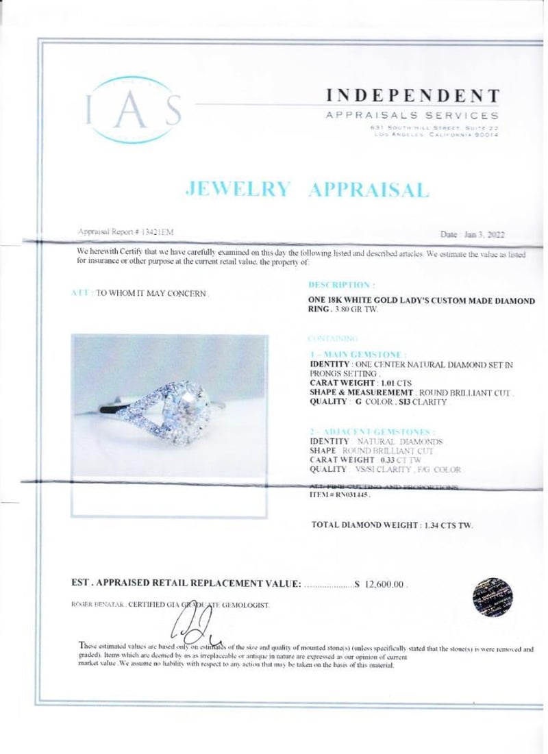 Indulge in the timeless elegance of this stunning 1.01-carat center diamond, radiating with a crisp G color and SI3 clarity, perfectly set in a luxurious 18K white gold ring. This piece is not merely jewelry; it is a statement of sophistication and grace, designed to capture attention and admiration at every glance.