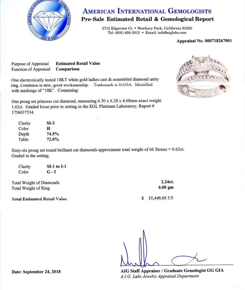 Indulge in the timeless allure of this exquisite 18K white gold ring, showcasing a breathtaking 1.62ct center diamond with SI3 clarity. This stunning centerpiece is a testament to nature's artistry, radiating brilliance and charm that captivates the eye from every angle. Surrounded by an enchanting array of additional diamonds totaling 2.24ctw, the ring's design reflects a harmonious blend of sophistication and modern elegance.