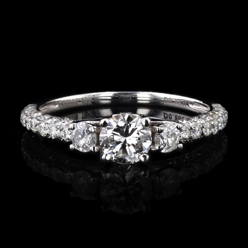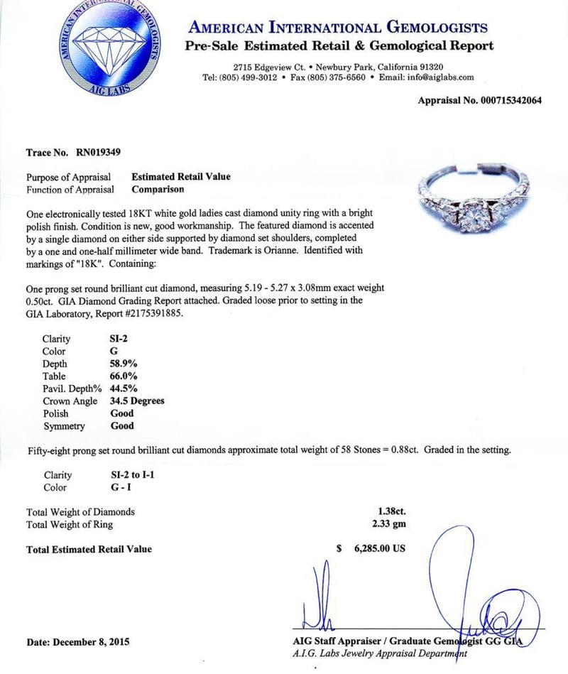 Indulge in the elegance of this stunning 18K white gold ring, featuring a captivating 0.50ct center diamond of SI2 clarity, artfully crafted to catch the light from every angle. This exquisite piece boasts a total diamond weight of 1.38 carats, showcasing a symphony of sparkling accents that enhance its radiant centerpiece.
