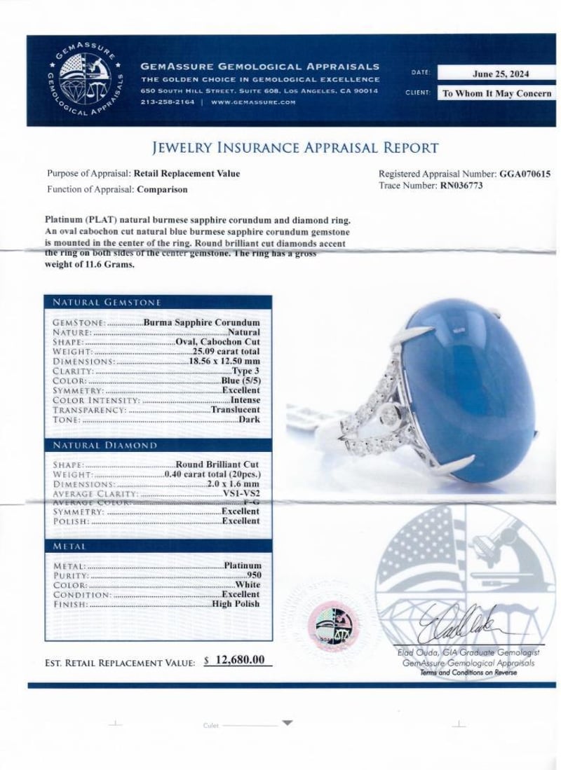 Indulge in the allure of this breathtaking ring, a true masterpiece that exudes elegance and sophistication. At the heart of this exquisite design lies a magnificent 25.09-carat blue Burmese sapphire, renowned for its vibrant hue that captures the depths of the ocean and the brilliance of a twilight sky. This exceptional gemstone is celebrated not only for its size but also for its remarkable clarity and stunning color saturation, making it a coveted treasure among connoisseurs of fine jewelry.