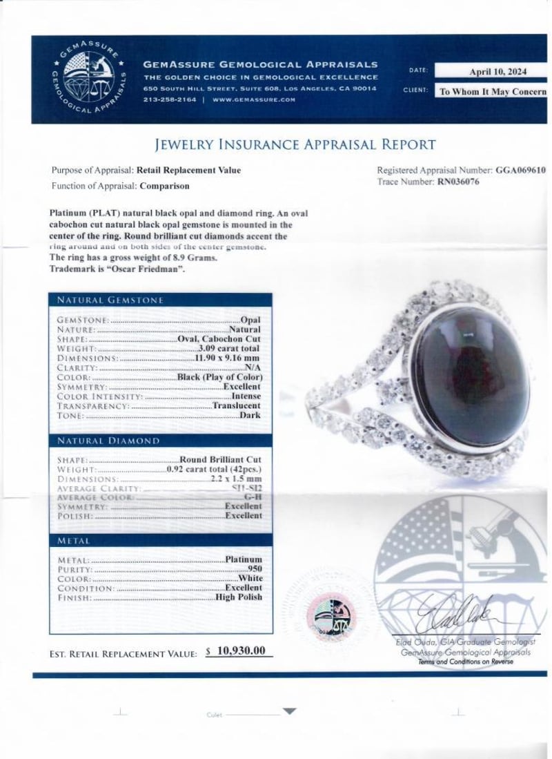 Surrounding this opal treasure is a dazzling halo of 0.92 carats of meticulously set diamonds, each one a brilliant reflection of light that enhances the opal’s inherent allure. Crafted in lustrous platinum, this ring not only ensures durability but also elevates the overall aesthetic, giving it a timeless elegance that transcends fashion trends.