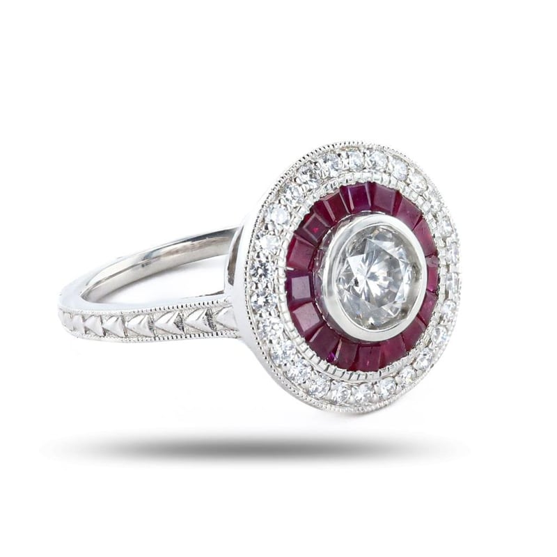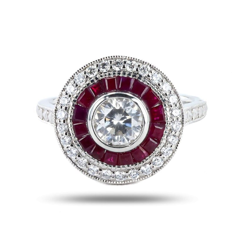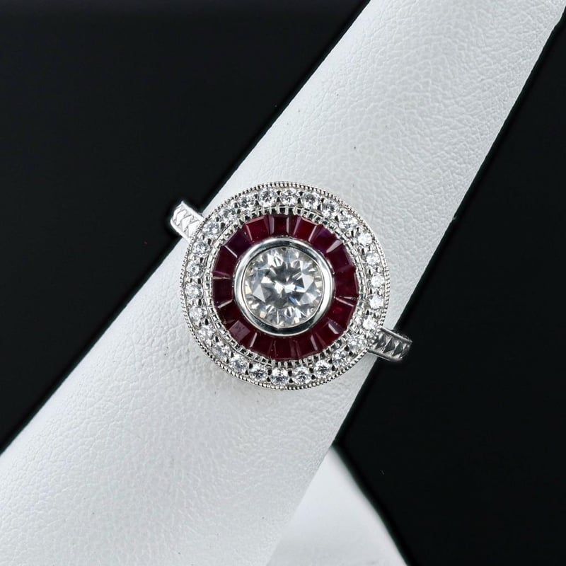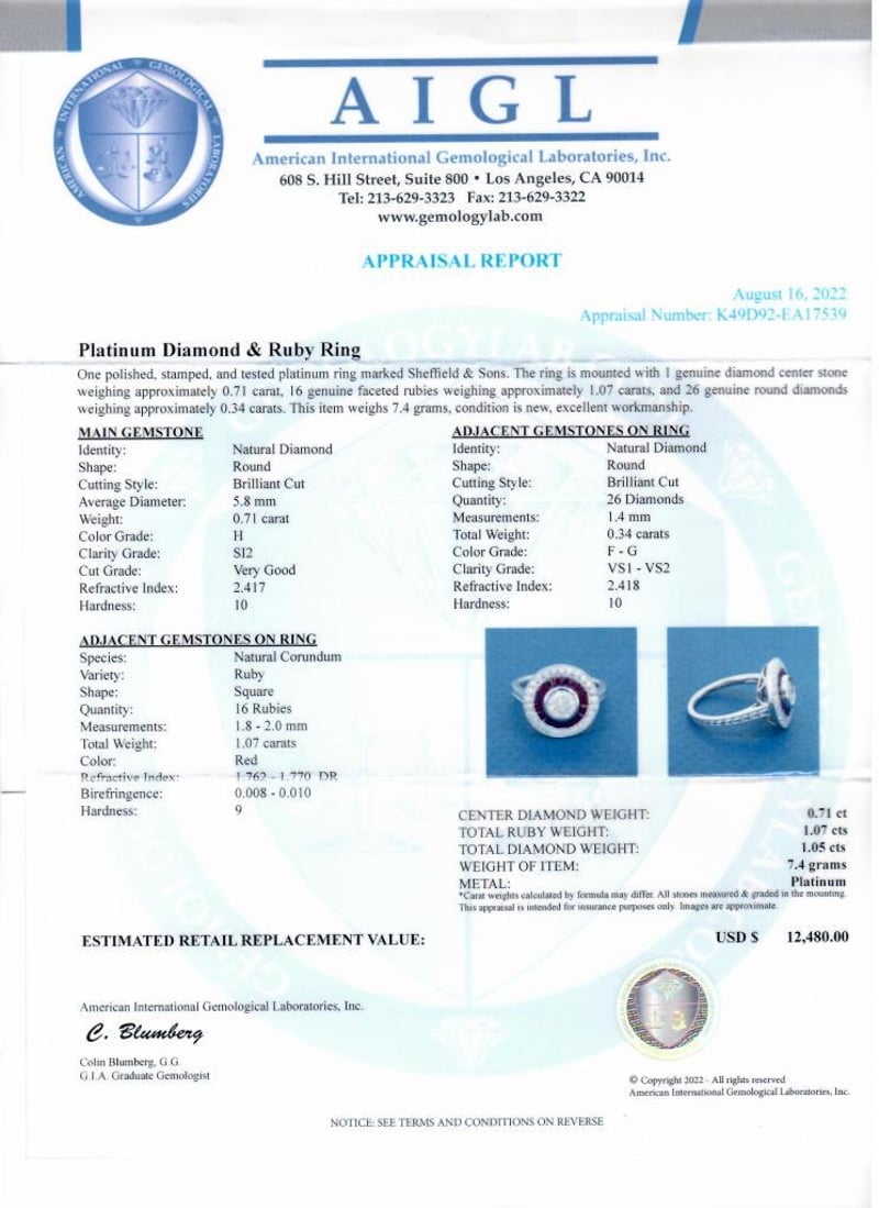 Indulge in the exquisite allure of this meticulously crafted platinum ring, a stunning testament to luxury and sophistication. At its heart, a brilliant 0.71-carat diamond radiates with an H color and SI2 clarity, captivating the eye with its fiery brilliance and captivating sparkle. This splendid gem is expertly set amidst a dazzling array of 1.05 carats of additional diamonds, enhancing the ring’s overall luminosity and providing a breathtaking contrast to the vibrant, deep red hue of the 1.07 carats of luscious rubies that gracefully encircle the centerpiece.