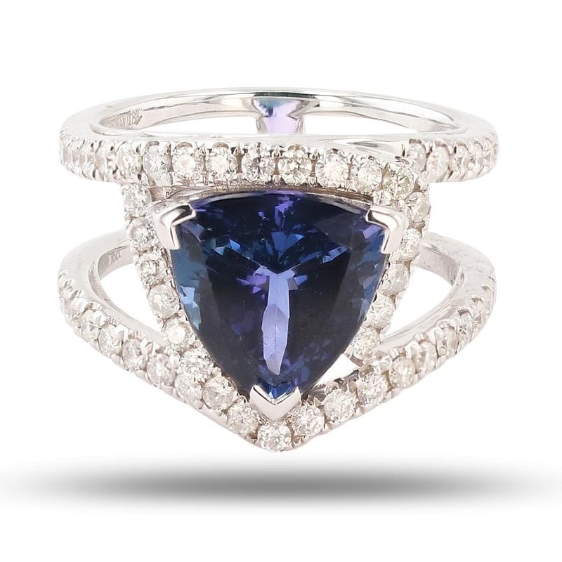 Indulge in the allure of this exquisite 18K white gold ring, a breathtaking symphony of color and brilliance that captivates the senses. At its center lies a mesmerizing 4.57-carat tanzanite, renowned for its enchanting violet-blue hue that shifts with the light, evoking the depths of twilight skies. This rare gemstone is artfully embraced by a halo of sparkling diamonds totaling 0.85 carats, each meticulously set to enhance the tanzanite's vibrant allure and ensure maximum radiance.
