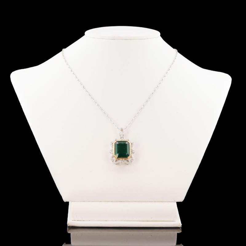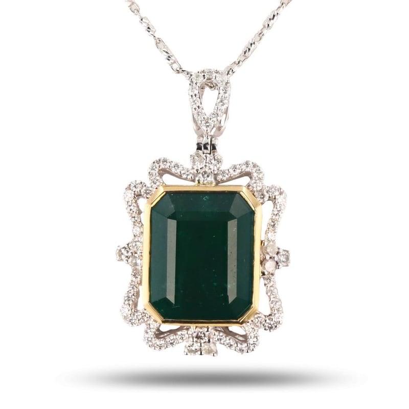 Indulge in the allure of timeless elegance with this breathtaking pendant, a true masterpiece that harmoniously combines the vibrant beauty of a 12.36ct emerald with the shimmering brilliance of 0.83ctw diamonds. Set in a luxurious 18K yellow and white gold setting, this pendant is not merely an accessory; it is a statement piece that speaks of sophistication and grace.