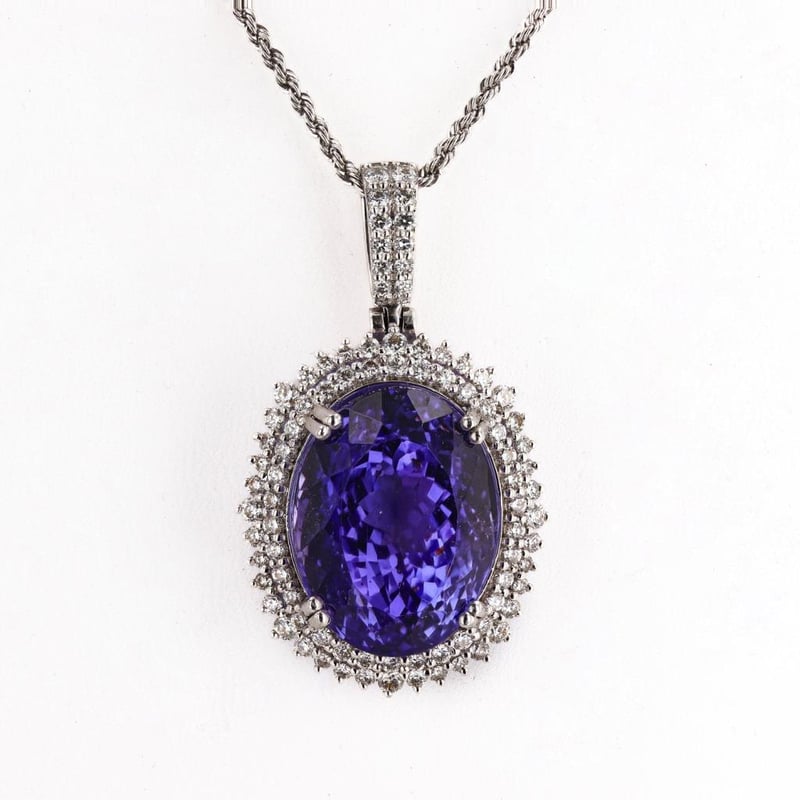 Encircling the captivating tanzanite is a halo of brilliant diamonds totaling 1.42 carats, each expertly selected for its clarity and brilliance. Set in luxurious platinum, the pendant not only ensures durability but also enhances the sparkling contrast of the diamonds against the deep, rich tones of the tanzanite.