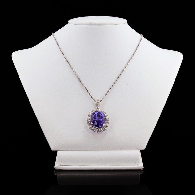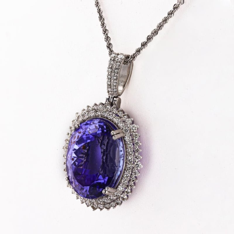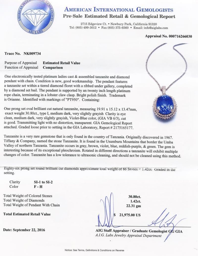 Exquisite 30.80ct Tanzanite and 1.42ctw Diamond Platinum Pendant (GIA CERTIFIED)