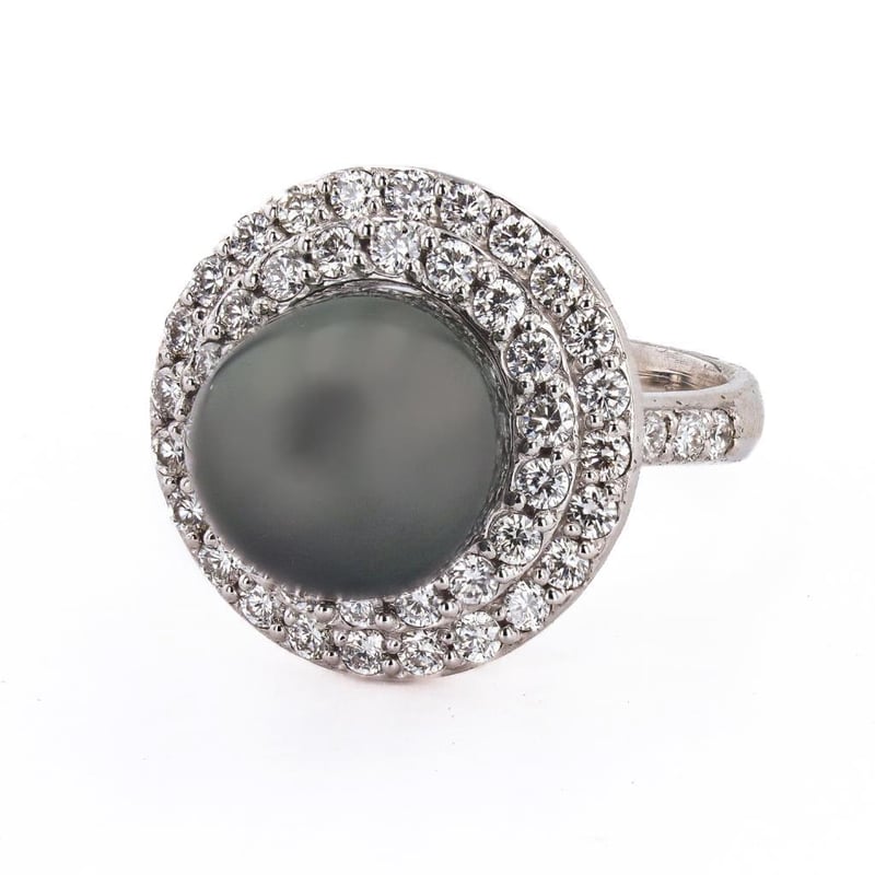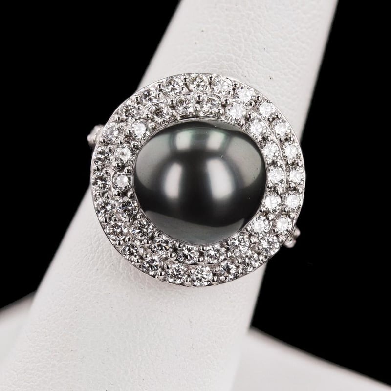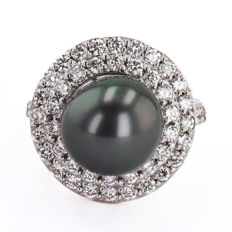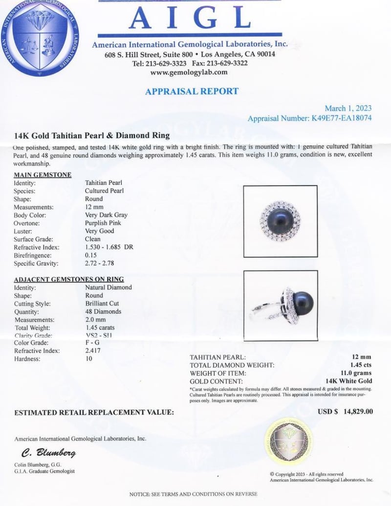 Lustrous Elegance: 12mm Tahitian Pearl and 1.45ctw Diamond 14K White Gold RingIndulge in the exquisite allure of this breathtaking ring, a perfect fusion of nature's beauty and timeless sophistication. At its heart lies a magnificent 12mm Tahitian pearl, renowned for its mesmerizing dark hues that shimmer with shades of peacock green and silvery gray, captivating the eye with every movement. This lustrous gem is elegantly embraced by a radiant halo of sparkling diamonds, totaling an impressive 1.45 carats, which dance in the light, adding a touch of opulence to this already stunning piece.Crafted in luxurious 14K white gold, the ring's setting provides a modern contrast to the organic beauty of the pearl, enhancing its elegance while ensuring a comfortable fit. The intricate design showcases the artistry and craftsmanship that went into creating this jewel, making it not only a statement piece but also a true work of art.Whether worn for a special occasion or as an everyday reminder of life’s finer pleasures, this Tahitian pearl and diamond ring is destined to leave a lasting impression. Elevate your jewelry collection with a piece that embodies sophistication and grace, and let it be a cherished symbol of your most cherished moments.
