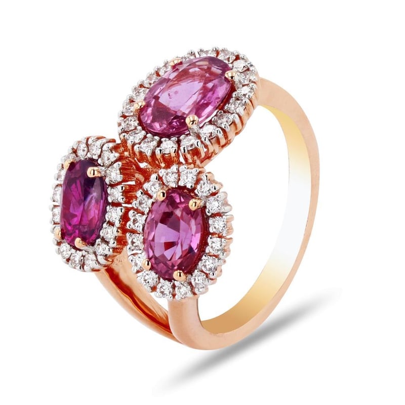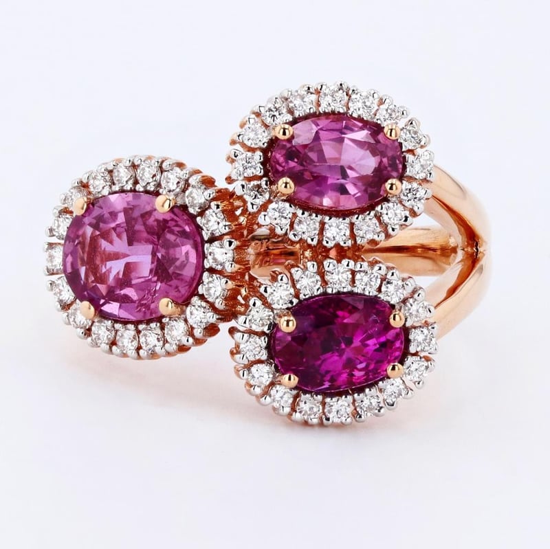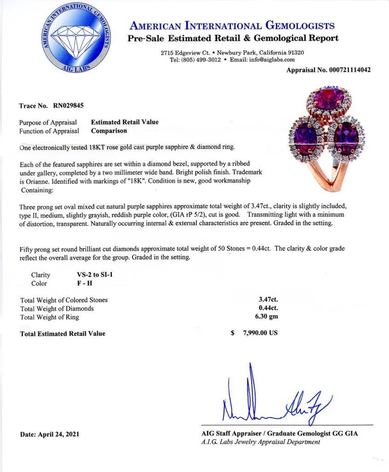 Step into a realm of opulence with this exquisite 18K rose gold ring, showcasing a breathtaking 3.47 carats of vibrant purple sapphires. The rich, royal hue of the sapphires evokes a sense of regal sophistication, while their expertly faceted cuts reflect light in a dazzling display. Surrounding these captivating gems are 0.44 carats of shimmering diamonds, each one carefully selected for its brilliance, enhancing the overall allure of the piece.
