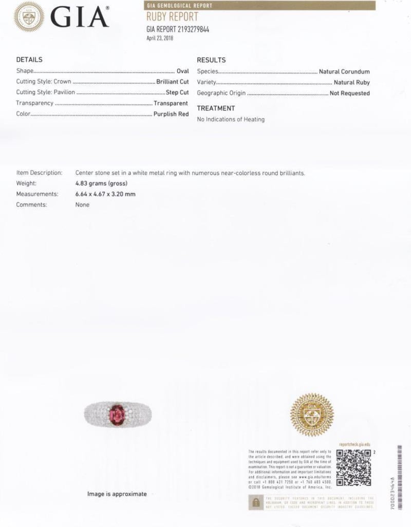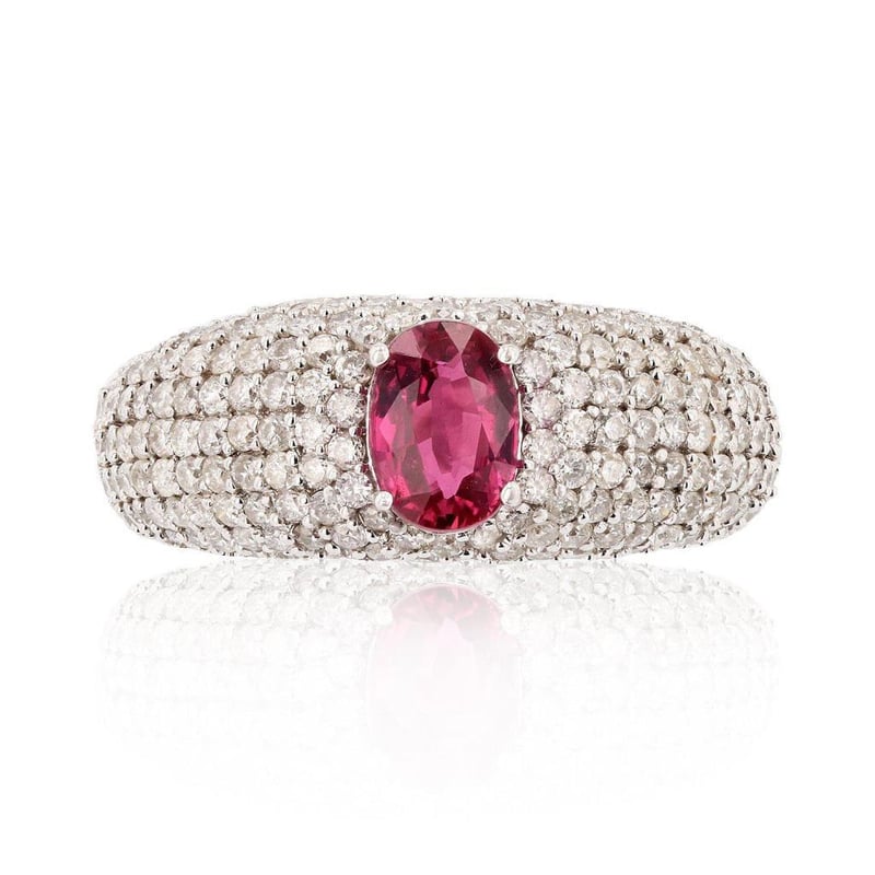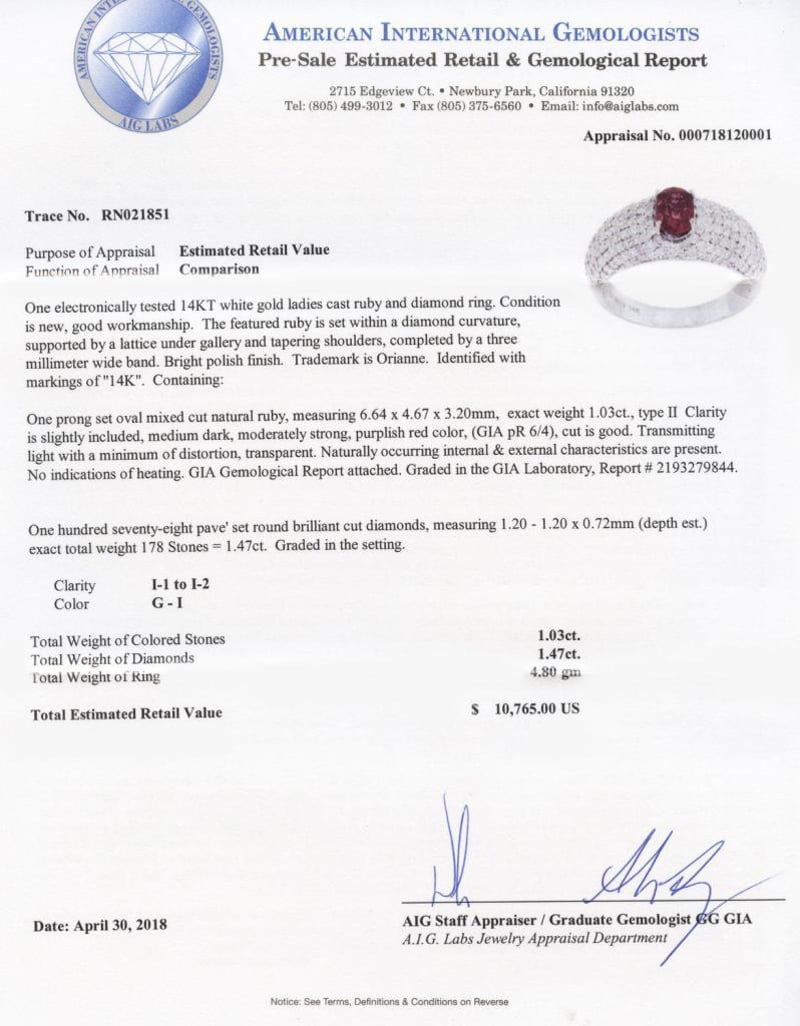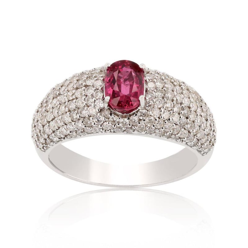 Radiant Elegance: 1.03ct Unheated Ruby and 1.47ctw Diamond 14K White Gold RingIndulge in the exquisite allure of this breathtaking 14K white gold ring, showcasing a stunning 1.03-carat unheated ruby at its center. Revered for its captivating hue, this ruby radiates a deep, mesmerizing red that symbolizes love and passion, making it the perfect statement piece for any occasion. Surrounding this magnificent gemstone are 1.47 carats of brilliant diamonds, expertly set to enhance the ring's overall sparkle and sophistication. Each diamond reflects a kaleidoscope of light, creating a dazzling contrast against the sleek white gold band, which is both modern and timeless in its design.Crafted for those who appreciate the finer things in life, this ring is not just a piece of jewelry; it is a testament to elegance and luxury. Whether you are celebrating a milestone or simply wish to indulge yourself, this unheated ruby and diamond ring is sure to be a cherished addition to your collection. Experience the allure of fine jewelry with a piece that embodies both beauty and rarity.