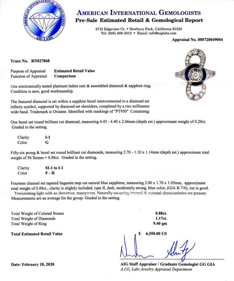 Adding to the enchanting design, a cascade of 0.88 carats of rich blue sapphires gracefully adorns the band, their velvety hues contrasting beautifully with the icy luster of the platinum. Each sapphire is meticulously selected for its vivid color and exceptional clarity, creating a mesmerizing spectacle that is hard to resist.