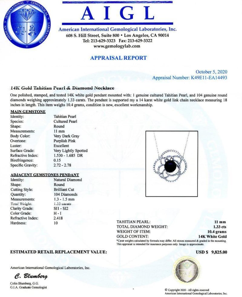 Indulge in the exquisite allure of this stunning necklace, a true embodiment of sophistication and artistry. At the heart of this luxurious piece lies an 11mm Tahitian pearl, renowned for its mesmerizing dark hues that range from deep charcoal to enchanting peacock, each pearl a unique testament to nature’s artistry. Suspended gracefully from a luminous 14K white gold chain, the pearl radiates an intoxicating glow, captivating all who behold it.