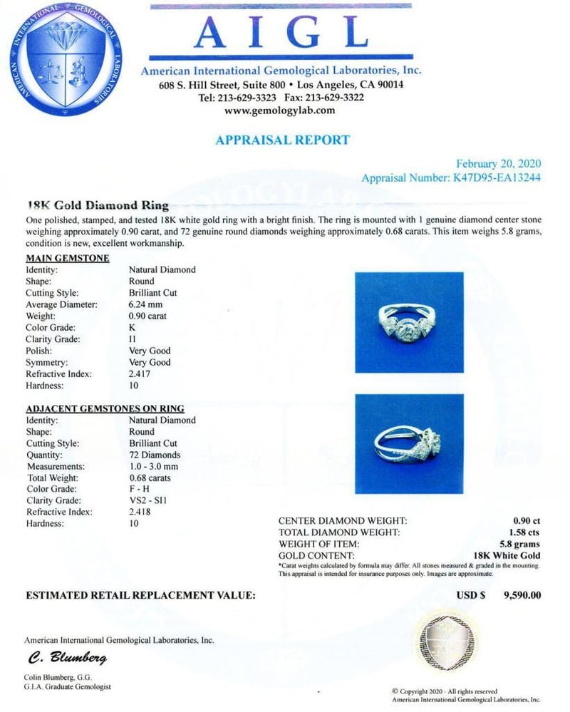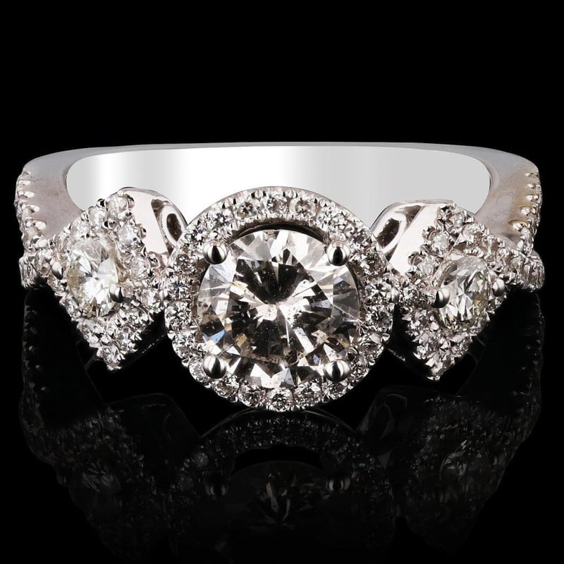Indulge in the sublime beauty of this exquisite 18K white gold ring, a true testament to timeless elegance and sophistication. At its heart lies a stunning 0.90ct center diamond, expertly cut to reflect light with breathtaking brilliance and fire. Surrounded by an additional 0.68ct of sparkling diamonds, this masterpiece boasts a total carat weight of 1.58ct, ensuring that it captivates the eye from every angle.