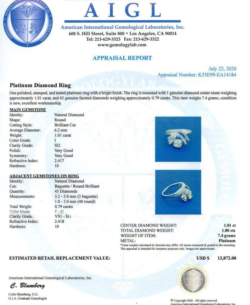Step into a realm of timeless beauty with this exquisite 1.01-carat diamond platinum ring, a true masterpiece that embodies elegance and sophistication. The centerpiece, a brilliant round diamond, sparkles with an exceptional clarity and fire, captivating all who behold it. Surrounded by a dazzling halo of additional diamonds, totaling 1.80 carats, this ring exudes an enchanting brilliance that is sure to turn heads and ignite conversations.