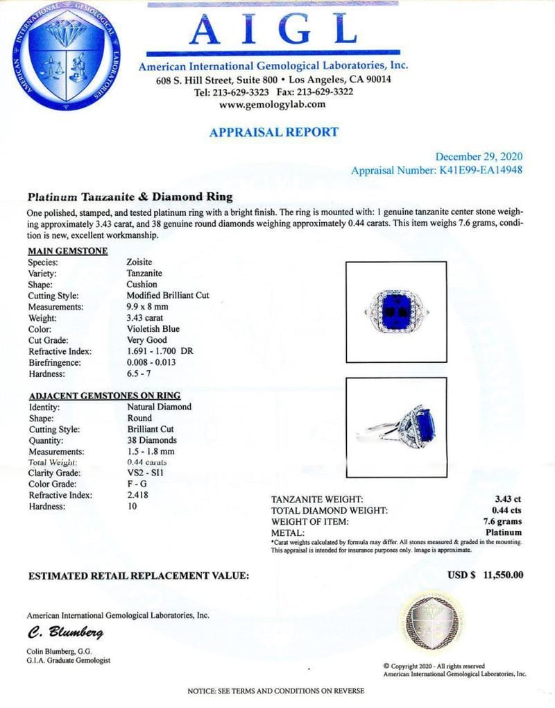 Exquisite 3.43ct Tanzanite and 0.44ctw Diamond Platinum Ring