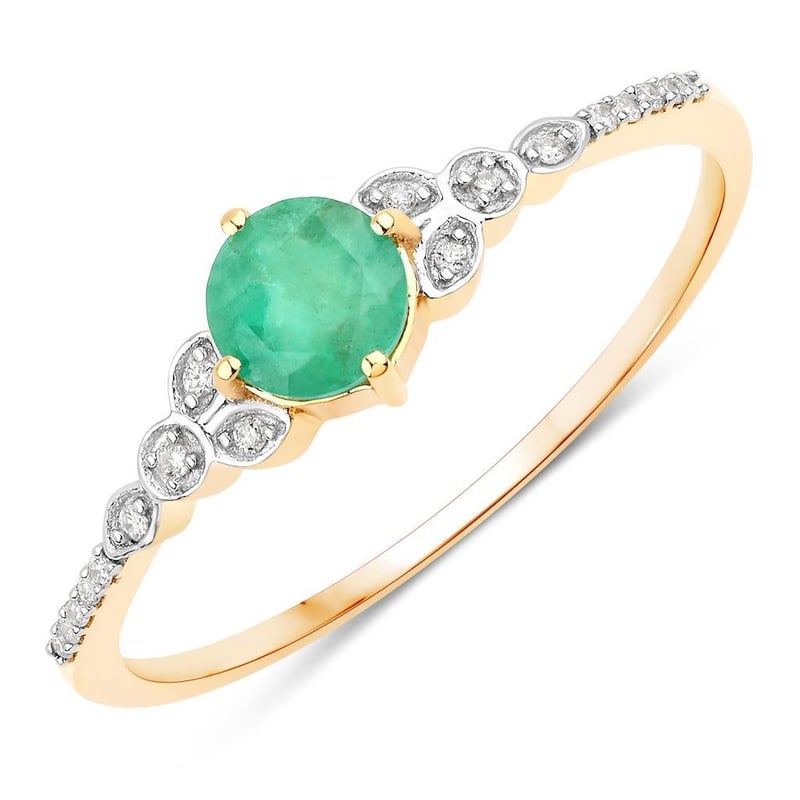 Exquisite 9K Yellow Gold Ring with Zambian Emerald and Sparkling White DiamondsIndulge in the elegance of this captivating 9K Yellow Gold Ring, a true masterpiece that seamlessly marries luxury and artistry. At its heart lies a stunning 5.00mm round Zambian Emerald, renowned for its rich, verdant hue and unparalleled clarity—an exquisite gem that evokes the beauty of nature in its purest form. Surrounding this verdant centerpiece are 18 dazzling white diamonds, each meticulously cut to a brilliant 0.80mm, displaying radiant SI-2 clarity and HI color grade. Their exceptional sparkle is enhanced by an enchanting white pen rhodium finish, which not only elevates their brilliance but also adds a touch of modern sophistication to the classic design.This ring is not just a piece of jewelry; it is a statement of elegance and refinement, perfect for the discerning individual who appreciates the finer things in life. Whether worn on a special occasion or as a daily adornment, this exquisite ring is destined to become a cherished heirloom, symbolizing love, prosperity, and timeless beauty. Don’t miss your chance to own this extraordinary piece that embodies the essence of luxury.