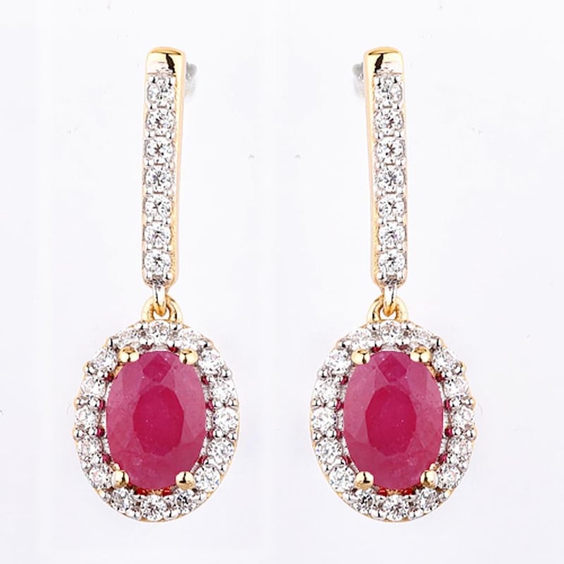 Indulge in the captivating allure of these stunning earrings, crafted from luxurious 9K yellow gold that radiates warmth and elegance. Each piece features a striking oval-cut ruby, measuring 7x5mm, that exudes a rich, velvety red hue, symbolizing passion and vitality. Enhanced by a scintillating halo of 46 round white diamonds, totaling 1.30mm each, these earrings are designed to dazzle with every movement.