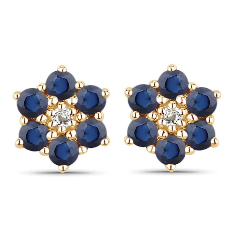 Indulge in the elegance of these stunning 9K Yellow Gold Earrings, a perfect blend of luxury and sophistication. Each earring features twelve radiant round blue sapphires, meticulously set at 2.00mm, showcasing their deep, mesmerizing hue that captures the essence of serene elegance. Complementing the sapphires are two brilliant white diamonds, each 1.50mm, with a clarity rating of SI-2 and a color grade of HI, ensuring that they sparkle with an enchanting brilliance.