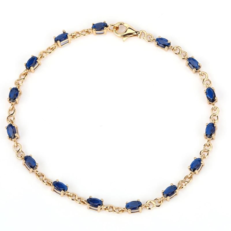 Indulge in the timeless elegance of this exquisite 9K yellow gold bracelet, designed to captivate and inspire. Featuring a stunning array of fifteen oval blue sapphires, each measuring 5x3mm, this piece radiates a rich and vibrant hue that beautifully contrasts with the warm glow of the gold.