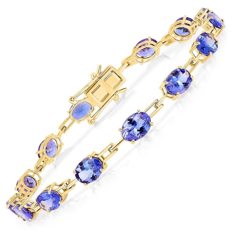 Indulge in the sublime elegance of this 9K Yellow Gold Bracelet, a statement piece that beautifully captures the essence of sophistication and grace. Featuring a stunning arrangement of 15 oval tanzanite gemstones, each measuring 7x5mm, this bracelet radiates a captivating allure that is sure to turn heads and ignite admiration.
