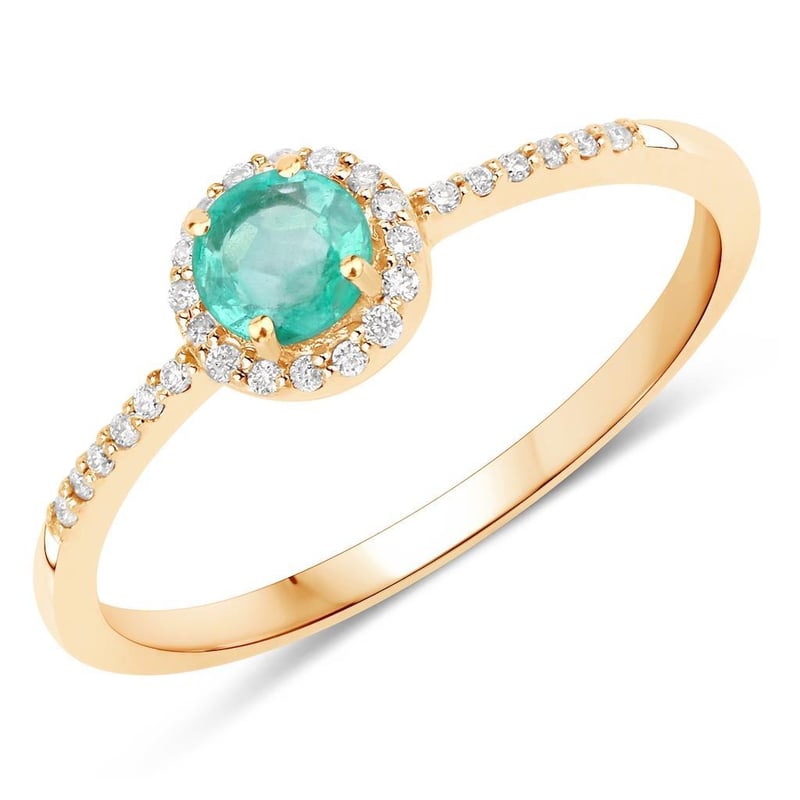 Indulge in the allure of this stunning 9K yellow gold ring, a true embodiment of elegance and sophistication. At the heart of this exquisite piece lies a captivating round Zambian emerald, measuring 4.00mm, radiant with its rich green hue that echoes the lush landscapes of its origin. This enchanting gemstone is expertly complemented by 28 sparkling white diamonds, each round diamond measuring 0.90mm. With a clarity grade of SI-2 and a color grade of HI, these diamonds exude a brilliant shimmer, creating a harmonious dance of light around the emerald.