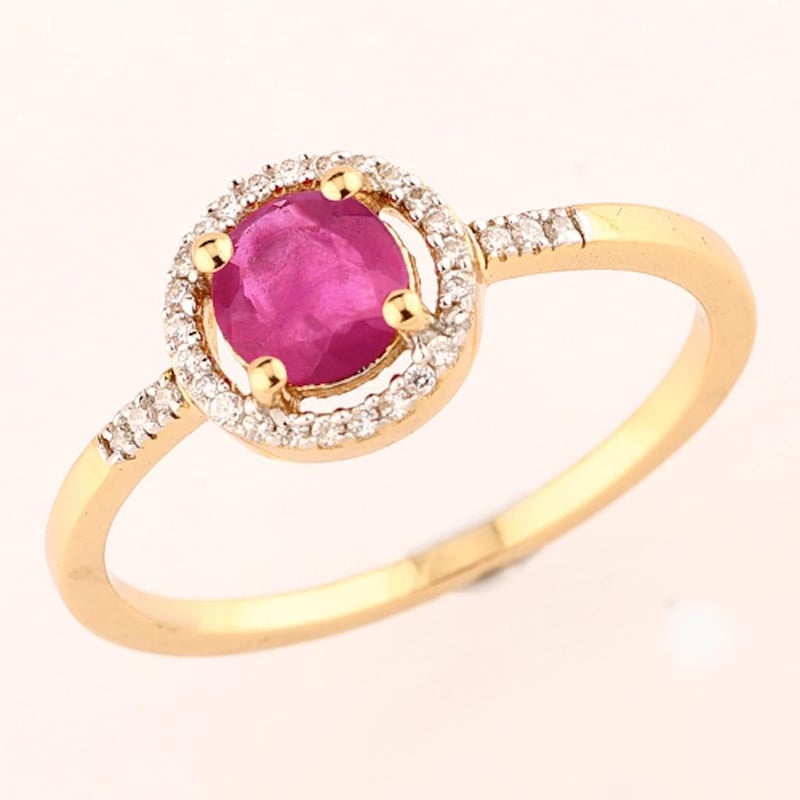 Indulge in the timeless elegance of this stunning 9K yellow gold ring, a true masterpiece that beautifully marries vibrant color and luxurious sparkle. At its heart lies a captivating 5.00mm round ruby, exuding a rich red hue that symbolizes passion and vitality. This radiant gemstone is complemented by an exquisite halo of 31 shimmering white diamonds, each meticulously set in a dazzling display that enhances the ring's allure.