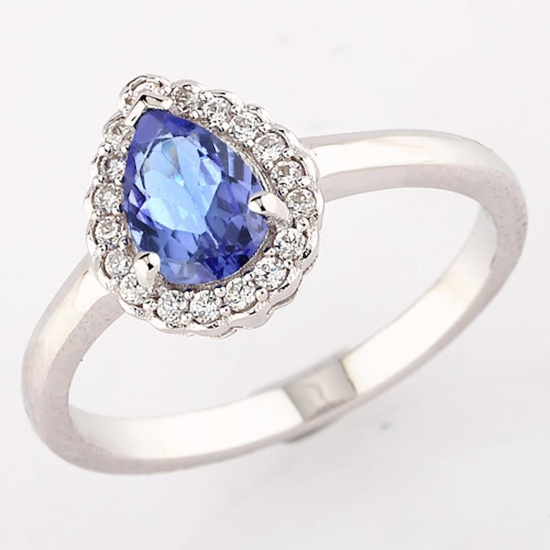 Indulge in the allure of this stunning 9K white gold ring, a true masterpiece that perfectly blends elegance and sophistication. At its heart, a captivating tanzanite pear, measuring 7x5mm, radiates a deep, enchanting violet hue that shifts beautifully in the light, evoking the splendor of twilight skies.