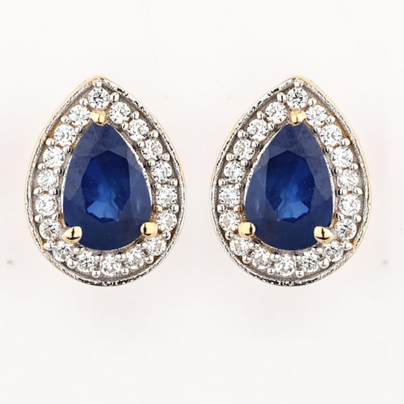 Elegant 9K Yellow Gold Blue Sapphire and Diamond EarringsIndulge in the epitome of elegance with these stunning 9K yellow gold earrings, meticulously crafted to showcase the radiant beauty of blue sapphires and brilliant white diamonds. Each earring features a pair of exquisite pear-shaped blue sapphires, measuring 6x4mm, that emanate a deep, captivating hue reminiscent of a twilight sky. Surrounding these enchanting gems are 36 sparkling round diamonds, each 1.00mm in size (SI-2/H-I clarity), artfully set in a luxurious white pen rhodium finish that enhances their brilliance and adds a touch of sophistication. The interplay of rich gold, vibrant blue, and shimmering white creates a harmonious balance that is both timeless and chic.Designed for comfort and ease, these earrings are equipped with a secure push post fastening, ensuring they stay in place while you dazzle at any occasion. Whether dressing up for a gala or adding a touch of glamour to your everyday look, these earrings are a perfect statement piece that exudes refinement and allure. Elevate your jewelry collection or gift someone special with this exquisite pair that captures the essence of elegance and luxury. Don’t miss the chance to own these magnificent earrings—where beauty meets craftsmanship.
