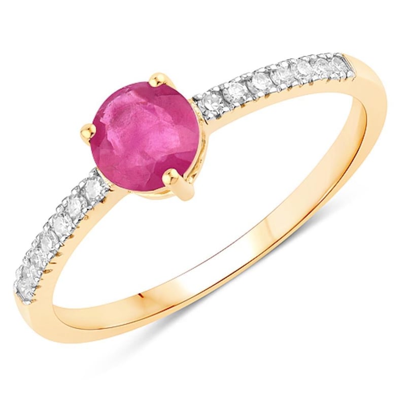 Indulge in the timeless elegance of this captivating 9K Yellow Gold Ring, a stunning centerpiece that harmoniously marries the rich allure of a vibrant ruby with the sparkling brilliance of white diamonds. At its heart lies a resplendent round ruby, a sumptuous 5.00mm gem that exudes a deep, passionate red hue, symbolizing love and passion. Surrounding this captivating center stone are fourteen meticulously set round white diamonds (1.20mm each, SI-2/H-I), which glisten like starlight against the warm backdrop of yellow gold, adding a layer of sophistication and radiance.