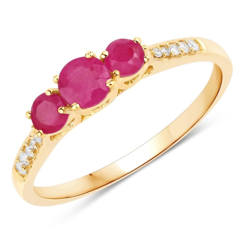 Indulge in the timeless elegance of this stunning 9K Yellow Gold Ring, a masterpiece that effortlessly combines the vibrant allure of rubies with the dazzling sparkle of white diamonds. At the heart of this exquisite piece lies a captivating 4.00mm round ruby, radiating a rich, velvety red hue that symbolizes passion and luxury. Accompanying this stunning centerpiece are two additional 3.00mm round rubies, each meticulously set to enhance the ring's overall allure and ensure a harmonious blend of color.