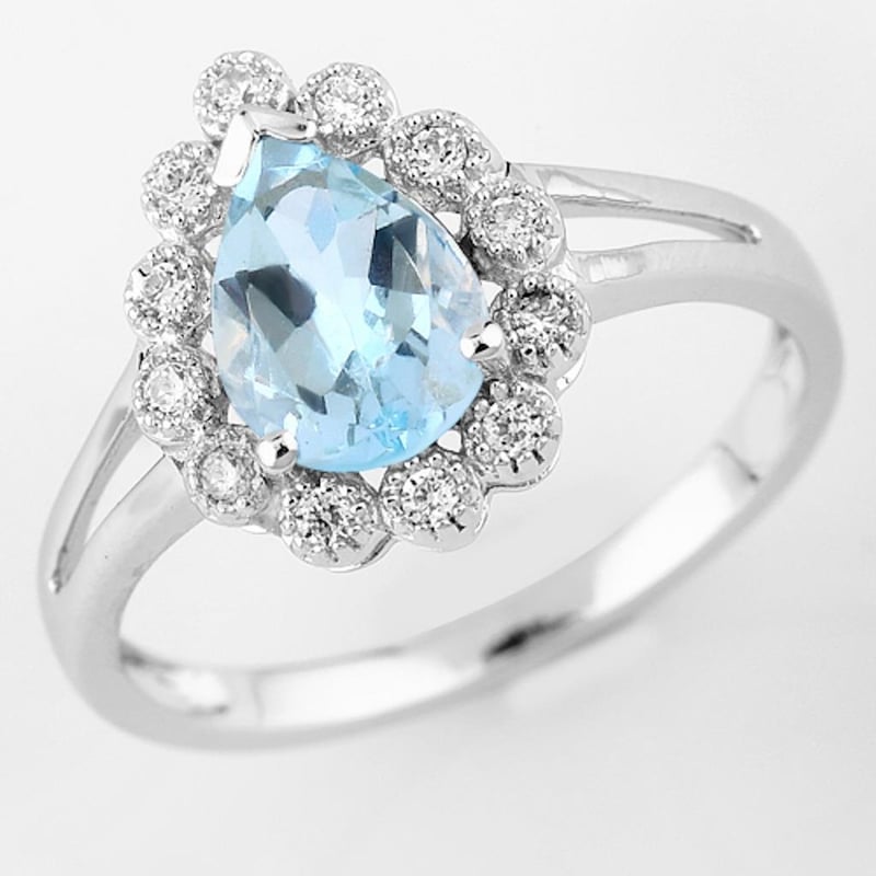 Indulge in the serene beauty of this exquisite 9K white gold ring, a true testament to timeless elegance. At its heart lies a stunning aquamarine pear-shaped gemstone, measuring a captivating 8x6mm. This enchanting blue gem, reminiscent of the tranquil ocean depths, is beautifully complemented by twelve sparkling round white diamonds, each measuring 1.30mm and graded SI-2/HI for exceptional clarity and brilliance.