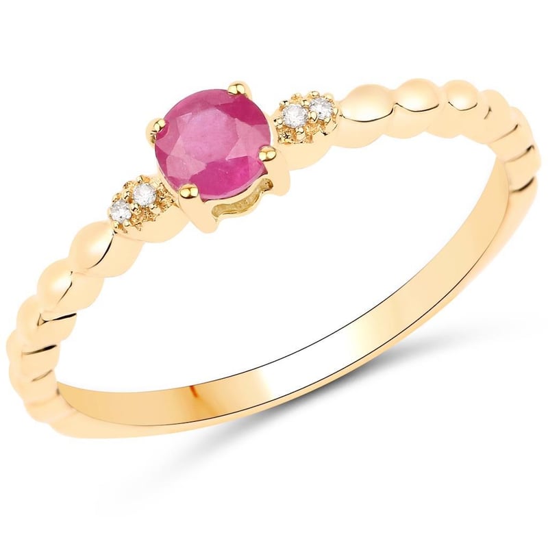 Indulge in the timeless allure of this stunning 9K yellow gold ring, a captivating piece that embodies elegance and sophistication. At its heart, a vibrant round ruby, measuring 4.00mm, radiates a rich crimson hue, symbolizing love and passion. This exquisite gemstone is beautifully complemented by four sparkling round white diamonds, each 0.80mm in size, showcasing a clarity grade of SI-2 and a brilliant HI color.