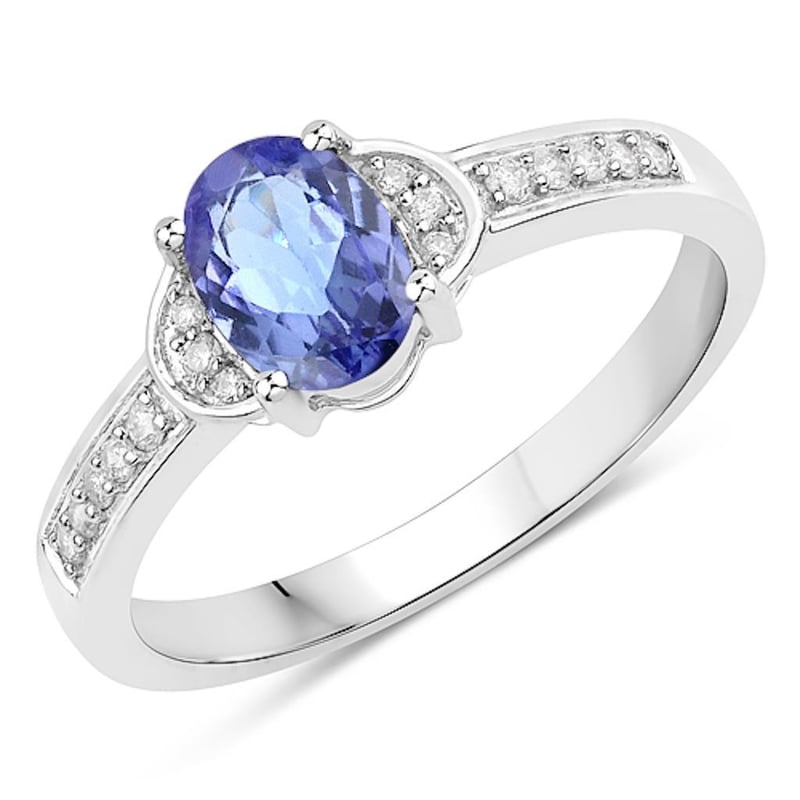 Indulge in the enchanting beauty of this luxurious 9K white gold ring, a stunning masterpiece that combines the captivating allure of tanzanite with the radiant sparkle of diamonds. At the heart of this exquisite piece lies a magnificent oval tanzanite, measuring 7x5mm, showcasing its mesmerizing violet-blue hues that shift with the light, evoking the depths of twilight skies.