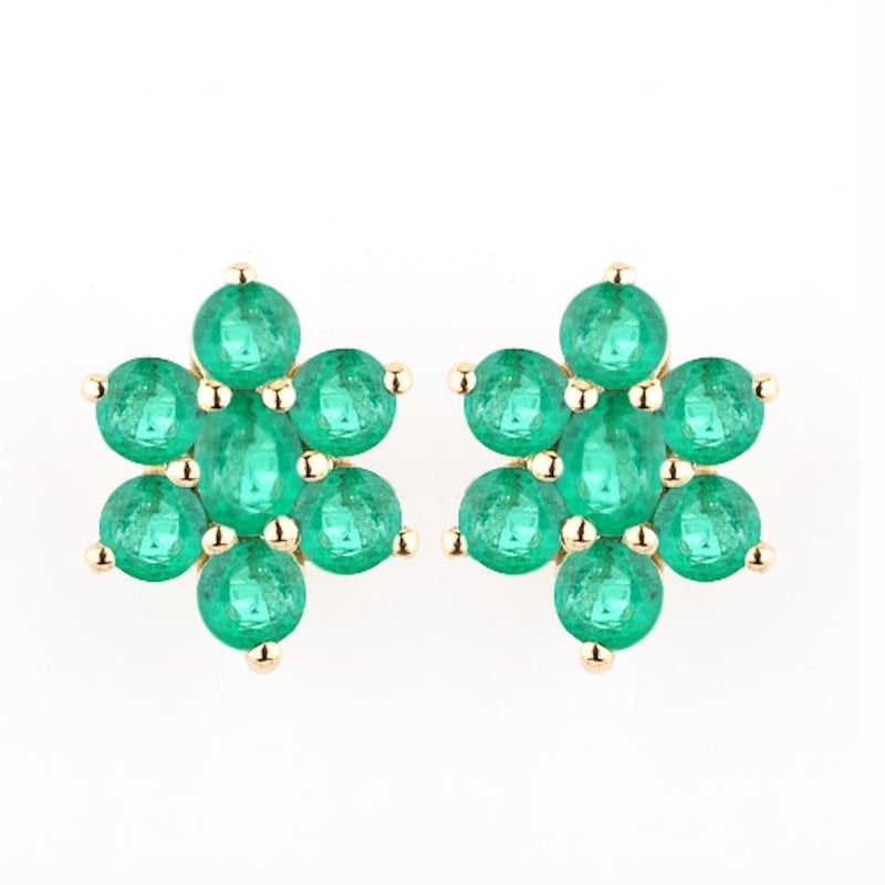 Indulge in the timeless allure of these exquisite 9K Yellow Gold Earrings, showcasing the captivating beauty of Zambian emeralds. Each earring features a stunning oval emerald, measuring 4x3mm, radiating a rich, verdant hue that evokes the lush landscapes of its African origin. Surrounding these striking ovals are twelve resplendent round emeralds, each 3.00mm in size, meticulously set to enhance their vibrant color and create a harmonious cascade of brilliance.