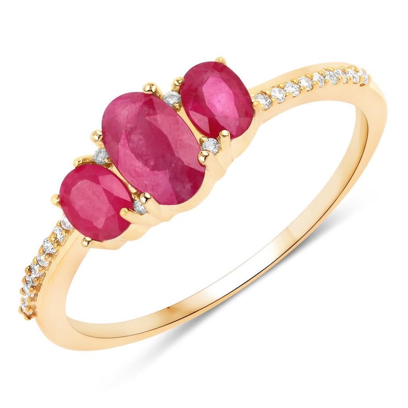 Exquisite 9K Yellow Gold Ruby and Diamond Ring: A Symphony of EleganceStep into a realm of opulence with this stunning 9K Yellow Gold Ring, a true testament to the artistry of fine jewelry. Adorned with a captivating oval ruby measuring 6x4mm, this piece radiates a rich, velvety red hue that symbolizes love and passion. Flanking the central gem are two additional oval rubies, each measuring 4x3mm, adding depth and allure to the design.The brilliance of this ring is further enhanced by the sparkling arrangement of 22 round white diamonds, each 0.80mm in size (SI-2/H-I clarity), meticulously set to create a dazzling contrast against the warm glow of the yellow gold. Their scintillating presence captures the light beautifully, making this ring a perfect statement piece for any special occasion.Crafted with precision and care, this ring embodies sophistication and timeless beauty. Whether worn as a symbol of love or a cherished addition to your jewelry collection, it is destined to be a favorite for years to come. Elevate your elegance with this magnificent treasure, where every glance reveals a story of luxury and grace.