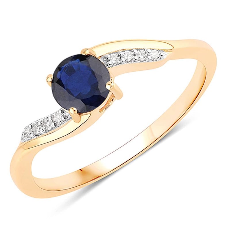 Indulge in a piece of timeless elegance with this stunning 9K yellow gold ring, an exquisite blend of luxury and artistry. At its heart, a captivating round blue sapphire, measuring 5.00mm, radiates deep oceanic hues that evoke a sense of tranquility and sophistication. This mesmerizing gemstone is surrounded by a sparkling constellation of white diamonds, totaling eight in number, that elevate its allure to celestial heights.