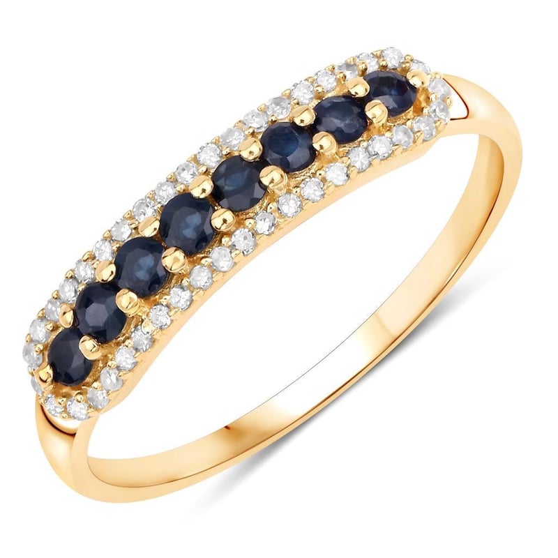 Exquisite 9K Yellow Gold Ring Adorned with Blue Sapphires and Sparkling DiamondsStep into a realm of elegance with this stunning 9K yellow gold ring, a masterpiece that effortlessly combines sophistication and allure. At its heart, this enchanting piece features eight radiant blue sapphires, each delicately cut into a perfect 2.00mm round, showcasing a deep oceanic hue that captures the light beautifully. Surrounding these vibrant gems are a dazzling array of forty-two white diamonds, each meticulously crafted to a 0.80mm round, exhibiting a brilliant sparkle that enhances the ring's overall opulence.The sapphires, known for their timeless beauty and symbolic connection to wisdom and nobility, are complemented by the shimmering diamonds, graded SI-2/H-I, ensuring a stunning clarity that dances with every movement. The harmonious blend of rich yellow gold and the vibrant blue and white stones creates a piece that is not only a statement of luxury but also a testament to fine craftsmanship.Whether worn as a symbol of love or as a statement accessory for any occasion, this exquisite ring is sure to capture hearts and turn heads. Elevate your jewelry collection with this extraordinary piece that embodies both grace and grandeur. Don’t miss your chance to own this captivating work of art!