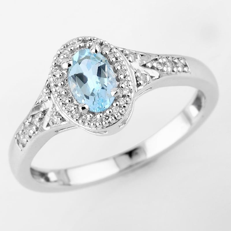 Indulge in the sublime beauty of this stunning 9K white gold ring, a true masterpiece that captures the essence of sophistication and style. At its heart lies a mesmerizing oval aquamarine, measuring 6x4mm, radiating a tranquil blue hue reminiscent of serene ocean waves. This captivating gemstone is embraced by a constellation of exquisite round white diamonds that elevate its allure to celestial heights.