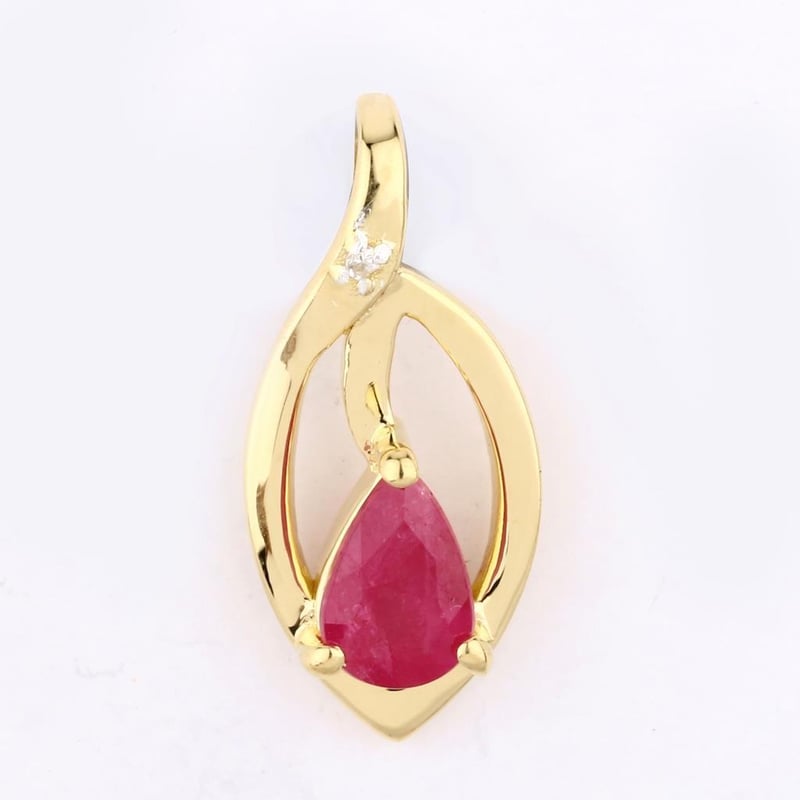 Indulge in the timeless elegance of this stunning 9K yellow gold pendant, a true masterpiece that captures the essence of sophistication and allure. Showcasing a vibrant pear-shaped ruby measuring 6x4mm, this captivating gemstone radiates a rich crimson hue that is both passionate and enchanting. Flanked by sparkling white diamonds, each with a delicate 1.00mm round cut, this pendant exudes a brilliance that dances with every movement.