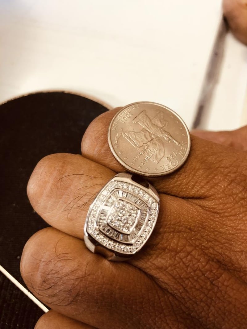 14K White Gold Men's Diamond Band Ring (1 cttw, H-I Color, SI1-SI2 Clarity) Vividly created from 14-karat white gold, this men's diamond band is stylish and classic. The top of the elegant ring features a rounded square design. The center flaunts nine round cut diamonds that are prong set into the square pattern. Further, the diamonds are captivated by a halo of sparkling baguette cut diamonds in a channel setting. While the second frame is adorned with a ring of round cut diamonds to add a glittery touch. Make him feel like a king with this diamond band.