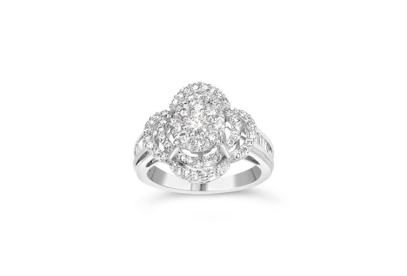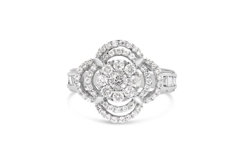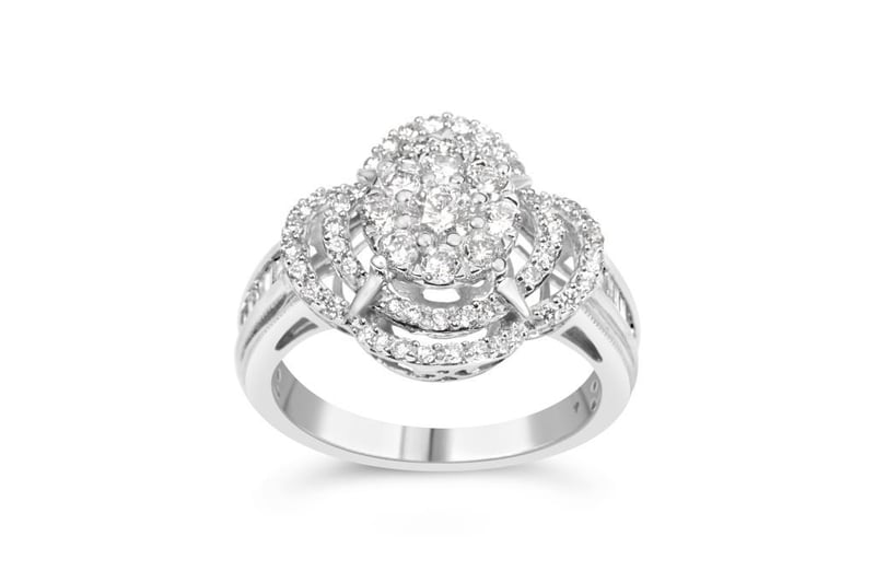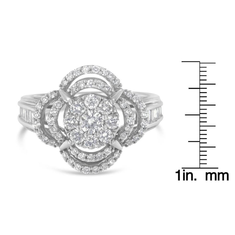 14K White Gold 1.0 Cttw Round & Baguette Cut Diamond Floral Cluster Quatrefoil Channel Set Band Cocktail Statement Ring (H-I Color, SI2-I1 Clarity) - Size 7 Elegant and timeless, this gorgeous 14K white gold diamond cocktail ring features 1.0 carat total weight of diamonds with a whopping 75 individual stones. The fashion ring features a round cluster with nine round, brilliant cut white diamonds centered inside flared quatrefoil petals studded with petite white gems. The tapered, cathedral style band features a row of channel set baguette cut diamonds with milgrain beading design details on the sides of the band. The ring has a decorative openwork filigree swirl gallery. This classic, feminine flower inspired cocktail ring makes a great gift for any special occasion! Whether worn for daytime glamour or evening sparkle, this cocktail ring is gorgeously versatile. Give her a gift that will perfectly complement her favorite ensemble.