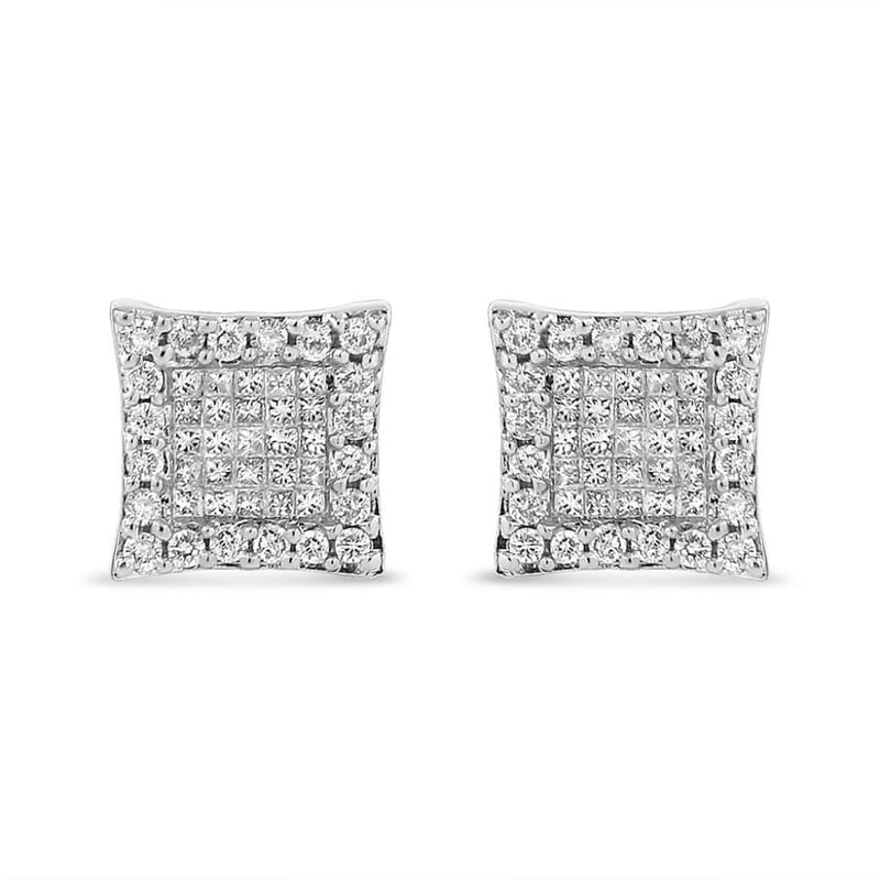 14K White Gold 1.00 Cttw Princess And Round-Cut Diamond Square Stud Earrings (G-H Color, SI1-SI2 Clarity) Elevate your everyday look with these intricate 14k white gold square studs. This beautiful piece is embellished with a central cluster of sparkling princess-cut diamonds, and flanked by natural, round-cut diamonds around the sides. The diamonds and gold work together to create a striking look. The total carat weight of these earrings is 1.00 cttw, making it the perfect bling to adorn any formal outfit with. This piece comes with a push back mechanism to create a safe and secure fit on your ears. Invest in these earrings and level up your jewelry game!